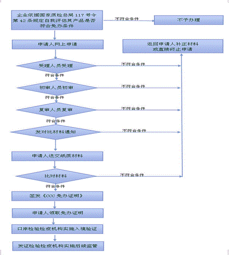符合以上条款条件的,可向检验检疫局科认处提出办理《免办理证明》(属于旧机电产品的,不受理《免办理证明》申请,按国家有关旧机电产品管理规定办理)。